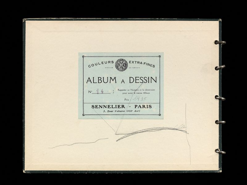 The front cover numbered 4 (not by the artist); the inside front cover with the supplier's label: […] Album à Dessin/ N° 14 […] Sennelier – Paris/ 3, Quai Voltaire (VIIe Arrt) and strokes of pencil; the inside back cover with a rough sketch of a castle very probably by another hand.