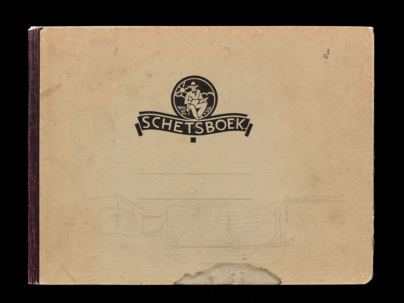 The front cover numbered 3 (not by the artist) with a vignette showing a seated draftsman with a hat and with beneath a mention Schetsboek (both printed) and rapid outlines in pencil of an unidentified building; the back cover with a vignette bearing the word ATLANTA and with beneath the number No. 482 (both printed) and pencil studies of a figure, hands and a cradle.